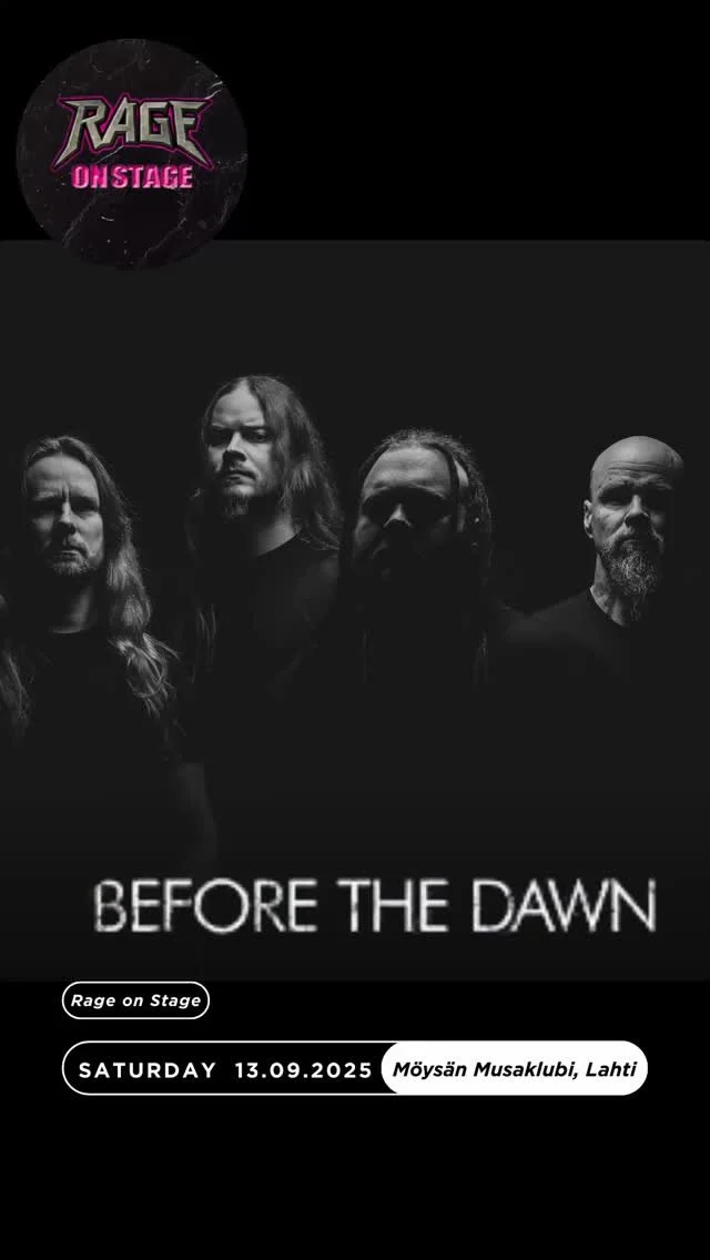 Lauantain pääesiintyjänä levynjulkkarikiertueensa juuri ennen Ragea starttaava metallisuuruus Before The Dawn, joka suuntaa Möysän Musaklubilta kiertueelle ympäri Eurooppaa. Illan muina tähtinä Suomen horror coren kärkinimi As I May, visuaalisesti sykähdyttävä Ode Of Disgrace, hurjassa livevedossa oleva Chainline sekä yleisöäänestyksen toisen sijan napannut pitkänlinjan metallijyrä Gothony.